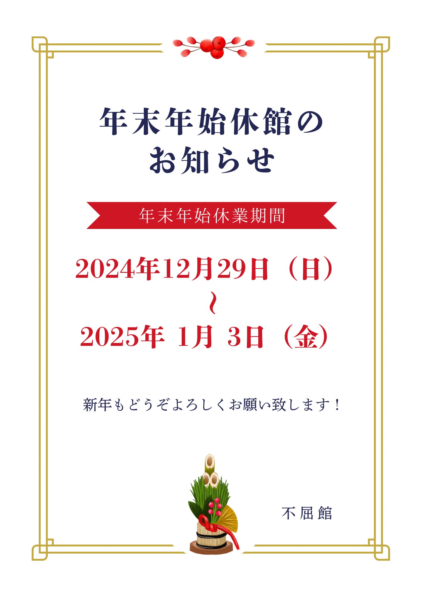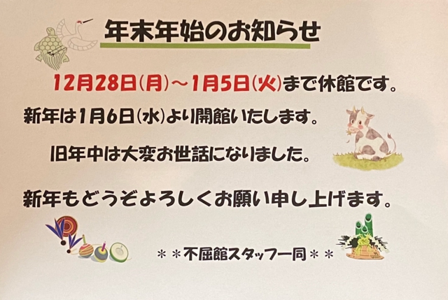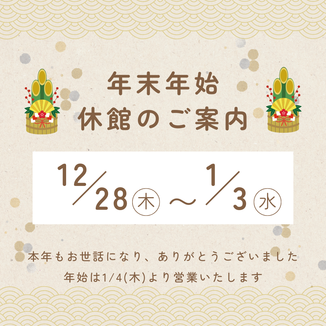 本館は12月29日(日)~1月3日(金)を休館とさせていただきますので、ご協力をお願いいたします。