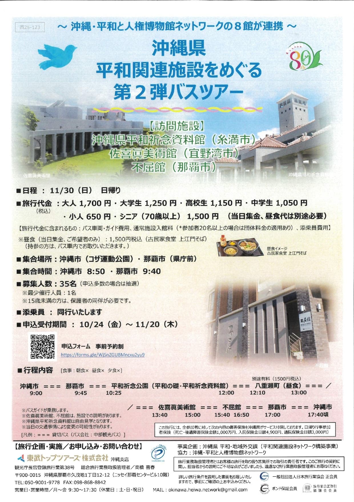 先日11月30日(日)沖縄県主催のバスツアー第2弾として、平和祈念資料館、佐喜眞美術館、不屈館に45名の方がご参加くださいました。沖縄の戦中・戦後、そして、アートでみることでより胸に伝わり、また、各館を巡ることで、点が線となり、よりたくさんのことを感じとれたのではないでしょうか。