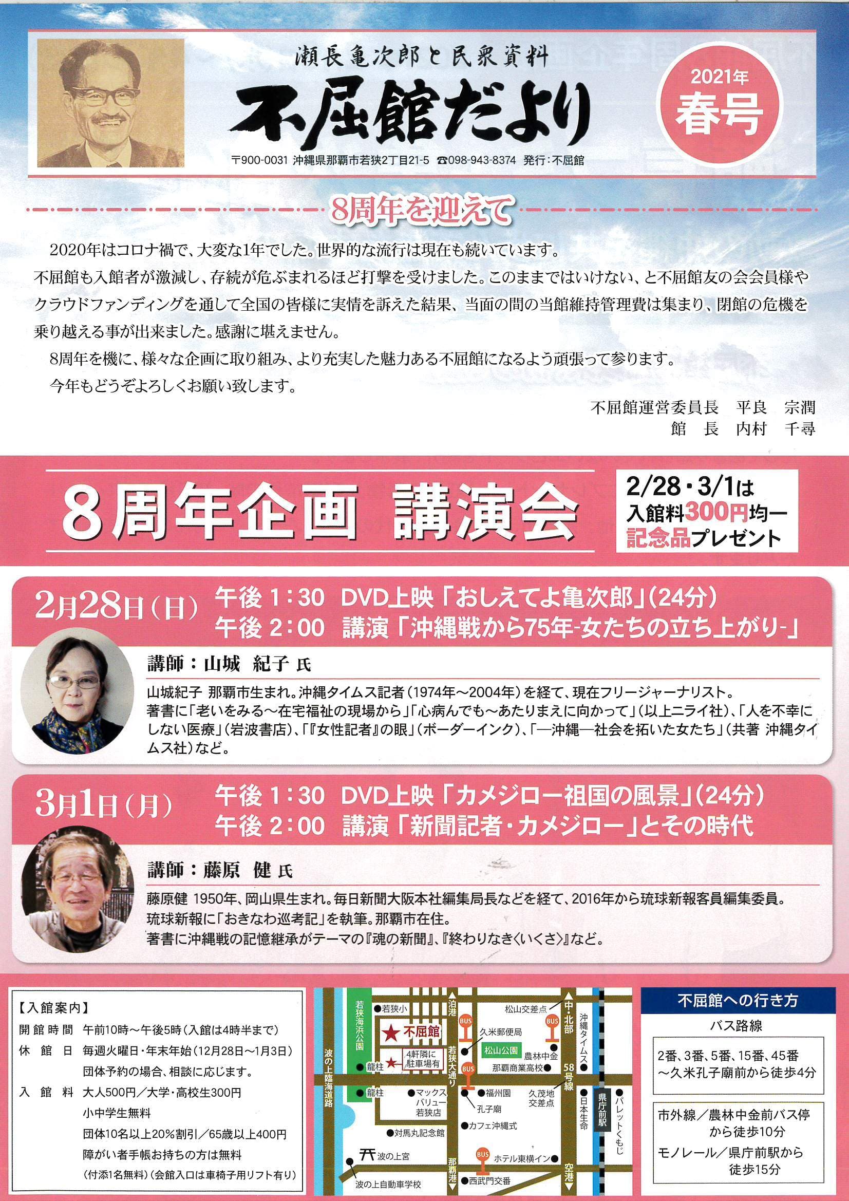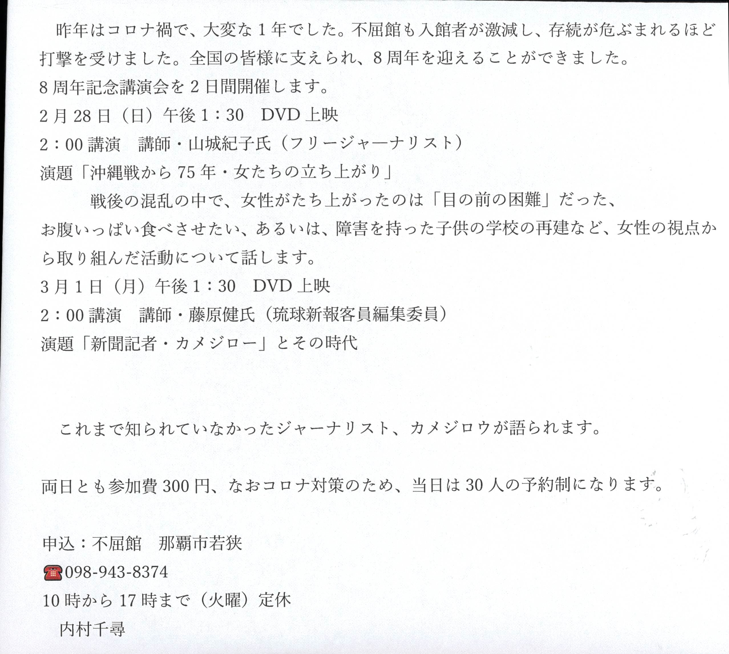 コロナ禍で皆様も苦しい状況の中、寄付を募る事はとても心苦しかったのですが、クラウドを通して、全国の皆様が瀬長亀次郎の事に興味を持っている事を知り、不屈館の想いに賛同して下さる方も多く、驚きながらも大変嬉しく思いました。