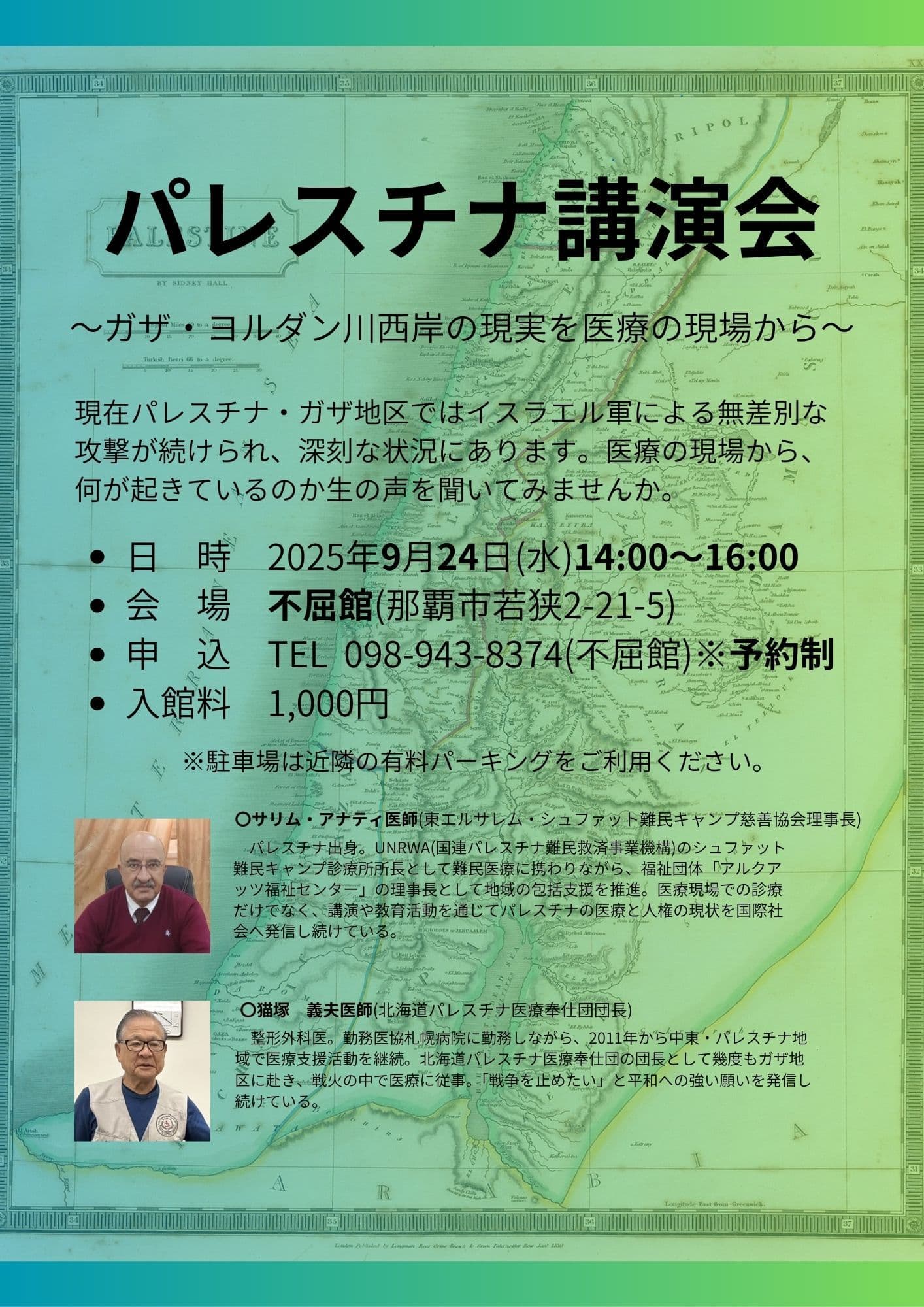パレスチナからサリム・アナティ医師が、北海道よりパレスチナ医療奉仕団団長の猫塚義夫医師が医療の現場から現状を語っていただきます。