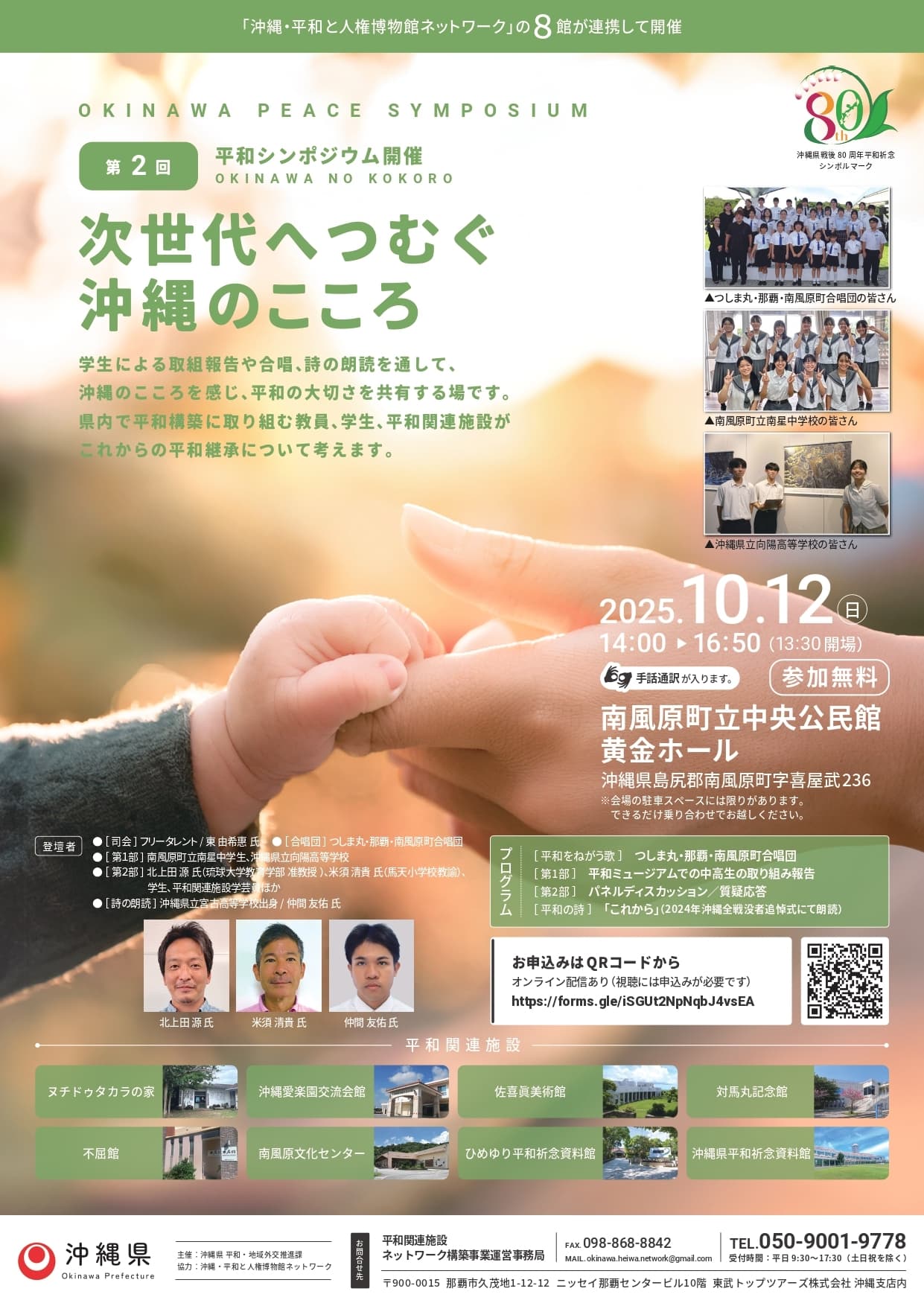 また、県内で平和構築に取り組む教員の方々の登壇、8施設(沖縄愛楽園交流館・沖縄平和祈念資料館・佐喜眞美術館・対馬丸記念館・ヌチドゥタカラの家・南風原文化センター・ひめゆり平和祈念資料館・不屈館)が登壇します。