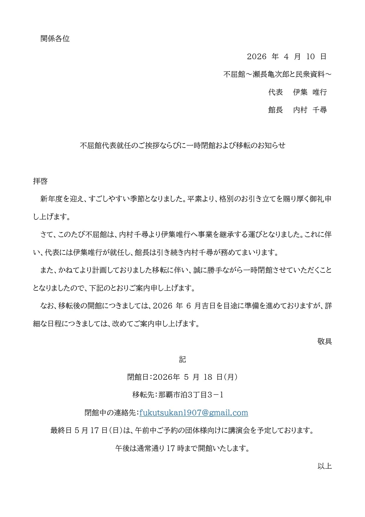 移転と閉館のお知らせ